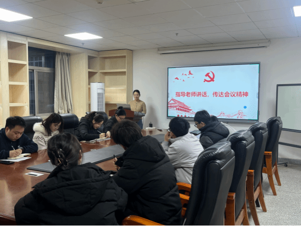 图为党支部指导老师强凤鸣老师讲话、传达会议精神