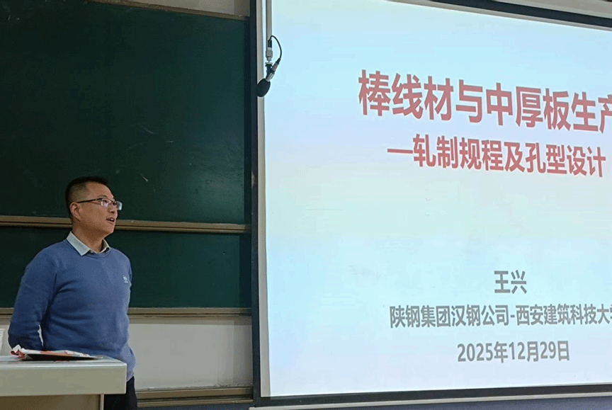 为提升实践类课程升级、强化学生专业课程设计实践能力、拓展学生专业视野和延宕学生就业思维,12月29日,《金属塑性工艺学课程设计2》课程特别邀请陕钢集团汉中钢铁有限责任公司产品开发部主任王兴走进课堂,为学生做了一场题目为《棒线材与中厚板生产—轧制规程及孔型设计》的专业报告。