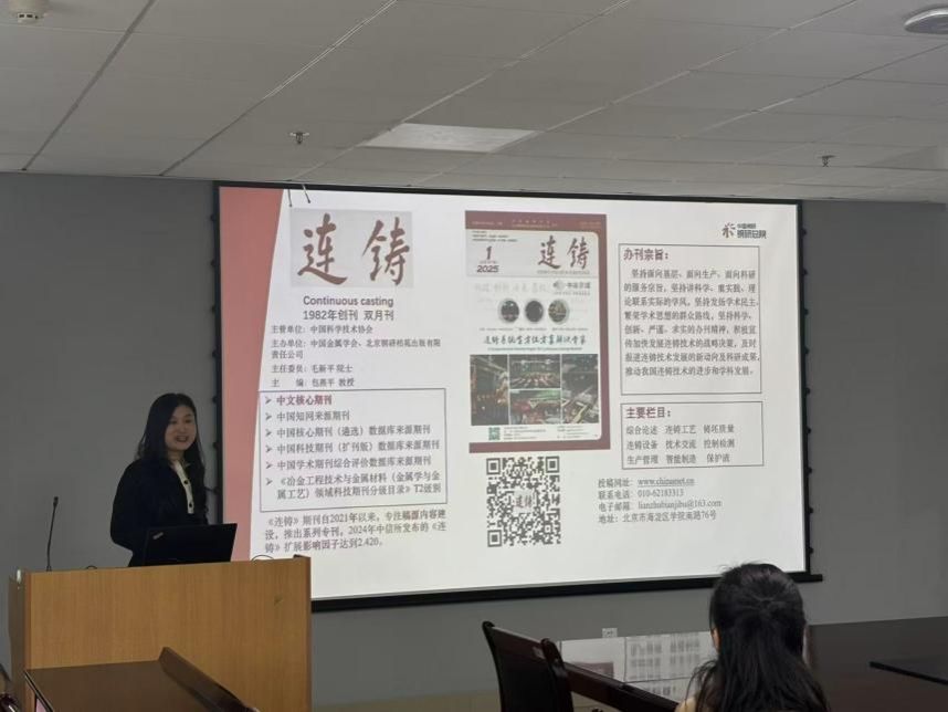 会上,李林波首先介绍了冶金工程学院的学科建设、师资力量、科研成果及人才培养等基本情况,全面阐述了学院在冶金领域的学科优势与发展规划。随后,北京钢研柏苑出版有限责任公司高丽平围绕《钢铁研究学报》《连铸》等核心期刊,从办刊定位、学术影响力、栏目设置、发展布局等方面进行了详细讲解,重点分享了期刊在行业内的学术地位、传播范围及未来发展方向。